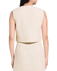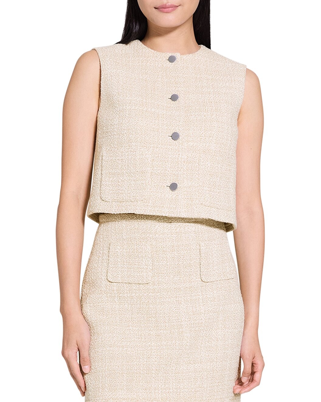 - About the brand: Theory believes the perfect outfit can change the way you feel. For over 25 years, Theory has developed innovative fabrics and highly functional pieces that feel great and fit perfectly. Theory's seasonal collections are versatile, expertly tailored and easy-to wear. - Color/pattern: brown - Design details: A straight fit vest with lower patch pockets and an exposed button closure. - 73% recycled cotton, 20% polyester, 4% recycled polyester, 3% other fibers - Dry clean only - Imported