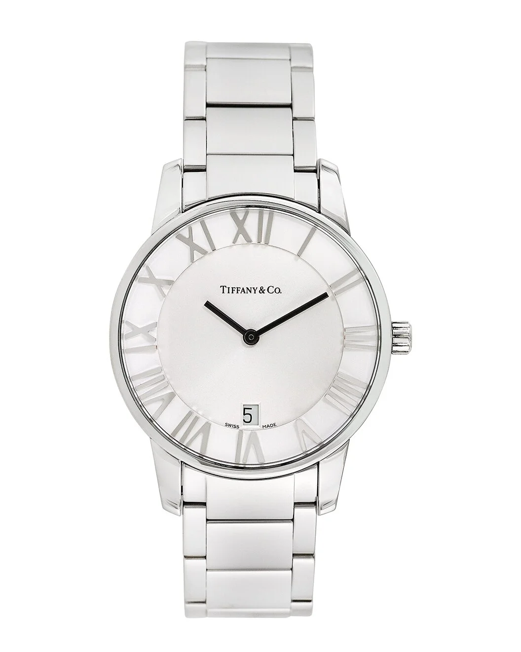- About the brand: Timeless beauty and superior craftsmanship - a jewelry icon. - Circa 2000s - This is an authentic, pre-loved Tiffany & Co. piece. It's possible that there may be some gentle wear. - Quartz movement - Stainless Steel bracelet - Hidden Butterfly clasp - Stainless Steel bezel - Stainless Steel case - Sapphire crystal - Push down crown - Silver dial - Case: 37mm - Bracelet/strap: 18mm wide x 7.5in long - Water-resistant up to 50 meters - Manufacturer's limited warranty - Independent Appraisal and Generic Box - The Watch Size Guide