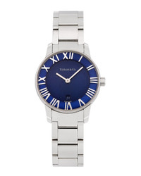- About the brand: Timeless beauty and superior craftsmanship - a jewelry icon. - Circa 2000s - This is an authentic, pre-loved Tiffany & Co. piece. It's possible that there may be some gentle wear. - Quartz movement - Stainless Steel bracelet - Hidden Butterfly clasp - Stainless Steel bezel - Stainless Steel case - Sapphire crystal - Push down crown - Blue dial - Date display - Case: 29mm - Bracelet/strap: 14mm wide x 6.5in long - Water-resistant up to 50 meters - Manufacturer's limited warranty - Independent Appraisal and Generic Box - The Watch Size Guide
