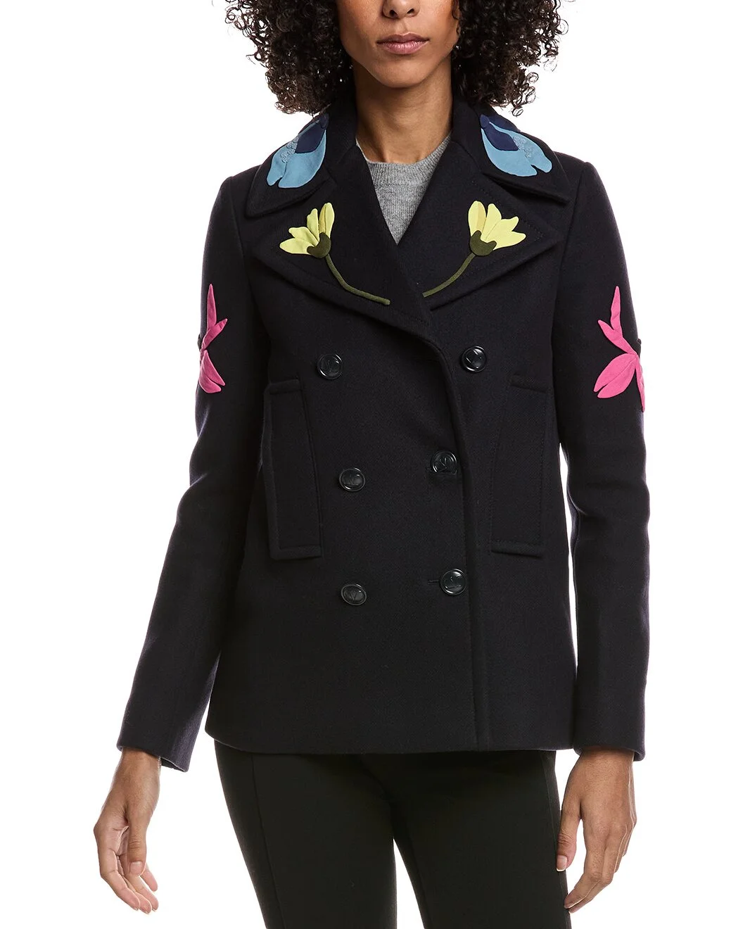 - About the brand: Signature elegance with a modern aesthetic. - Applique Wool-Blend Peacoat in navy with front pockets - Please note: Size selections are European. For US conversions, please reference the size chart. - Approximately 26in from shoulder to hem - Model is 5'9 and is wearing a size 36. Measurements may vary slightly by size. - Double-breasted button closure - Shell: 70% virgin wool, 30% nylon - Lining: 100% cupro - Embroidery 1: 100% polyester - Embroidery2 : 65% virgin wool, 35% silk - Dry clean only - Made in Italy - Our products are 100% genuine.  In some cases we purchase merchandise from trusted independent suppliers and not directly from the brand owner.  In all cases we stand by the authenticity of every product sold on our site.