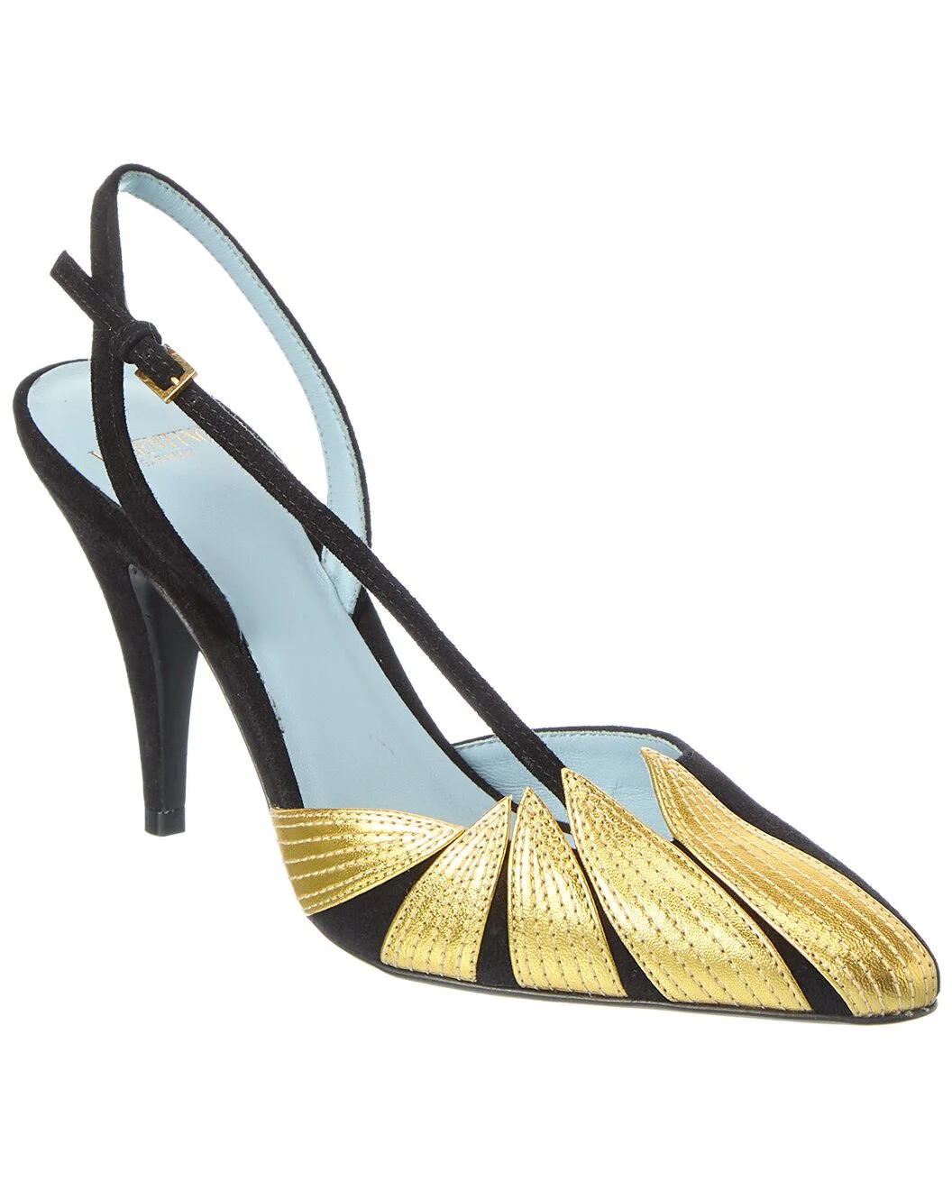 - About the brand: Signature elegance with a modern aesthetic. - Please note: Size selections are European. For US conversions, please reference size chart. - Based on feedback from Members, this brand typically runs small. We suggest sizing up a half size for most styles. - Made in Italy - Foliefoliage 90 Leather & Suede Slingback Pump in black suede and gold leather and gold-tone hardware with VLogo accent - Adjustable ankle strap with buckle closure - Lightly padded leather insole - Smooth leather sole - 3.5in heel - Please note: All measurements are approximate and were taken from a size 37; slight variations may occur. - Our products are 100% genuine. In some cases we purchase merchandise from trusted independent suppliers and not directly from the brand owner. In all cases we stand by the authenticity of every product sold on our site.