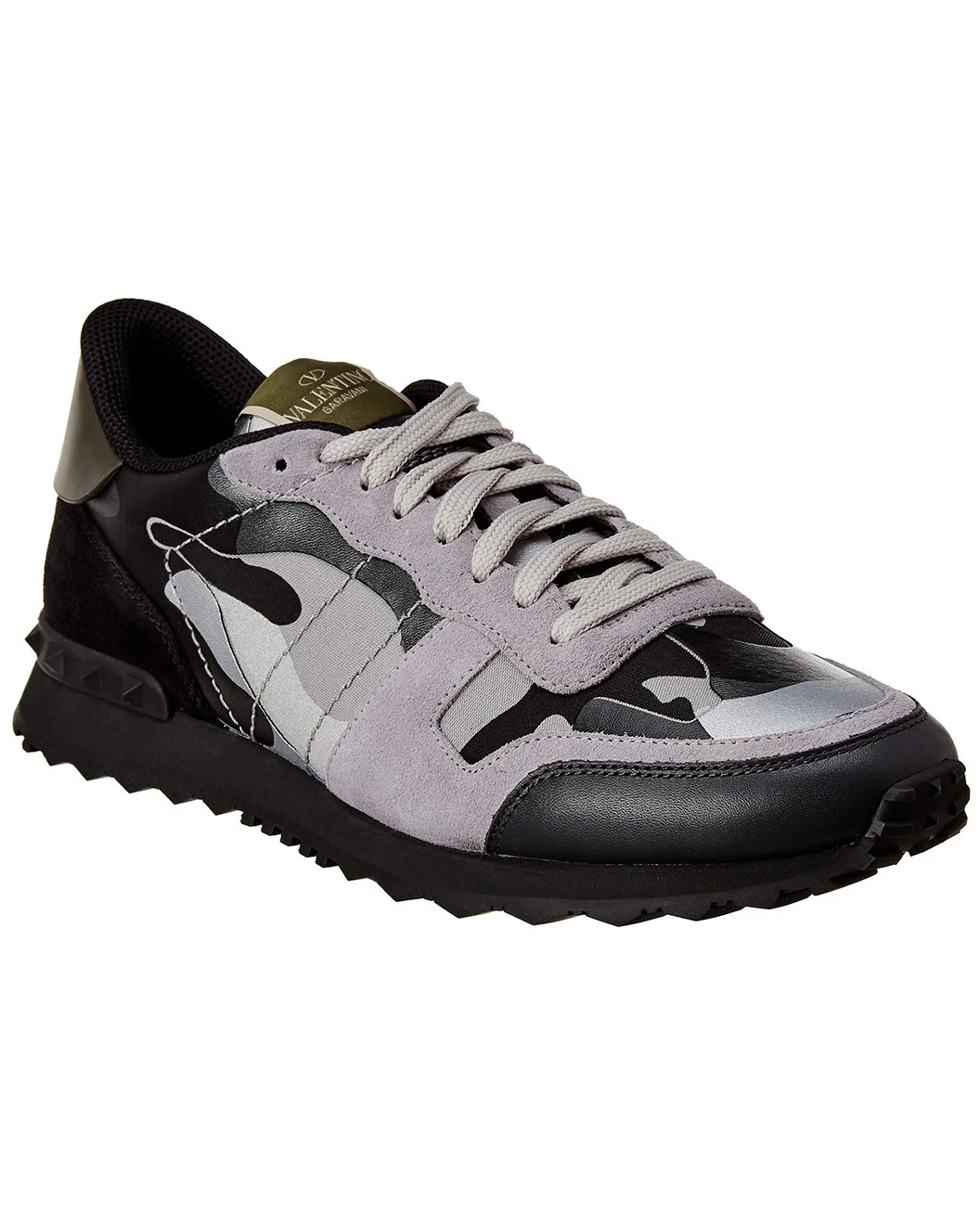 - About the brand: Signature elegance with a modern aesthetic. - Please note: Size selections are European. For US conversions, please reference size chart. - Made in Italy - Rock Runner Camouflage Reflective Suede & Leather Sneaker in black and grey suede and camo leather and textile with rubber pyramid stud details at heel - Lace-up closure - Moderately padded footbed - Rubber sole with traction - 1.3in heel - Please note: All measurements are approximate and were taken from a size 43; slight variations may occur. - Our products are 100% genuine. In some cases we purchase merchandise from trusted independent suppliers and not directly from the brand owner. In all cases we stand by the authenticity of every product sold on the site.