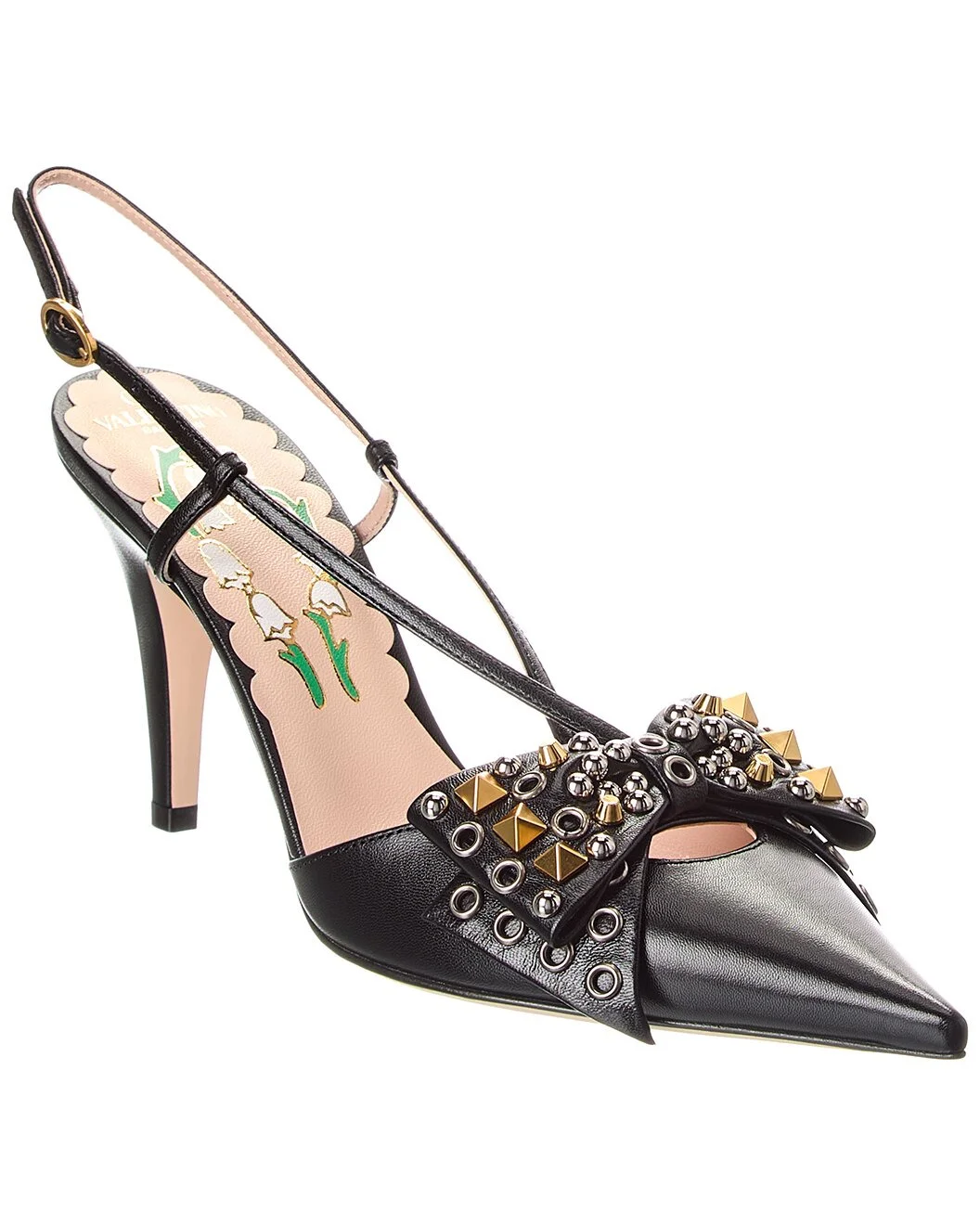 - About the brand: Signature elegance with a modern aesthetic. - Please note: Size selections are European. For US conversions, please reference size chart. - Based on feedback from Members, this brand typically runs small. We suggest sizing up a half size for most styles. - Made in Italy - VLogo 85 Leather Slingback Pump in black leather and gold-tone and silver-tone hardware with VLogo and stud-embellished bow - Adjustable ankle strap with buckle closure - Lightly padded leather insole - Smooth leather sole - 3.5in heel - Please note: All measurements are approximate and were taken from a size 37; slight variations may occur. - Our products are 100% genuine. In some cases we purchase merchandise from trusted independent suppliers and not directly from the brand owner. In all cases we stand by the authenticity of every product sold on our site.