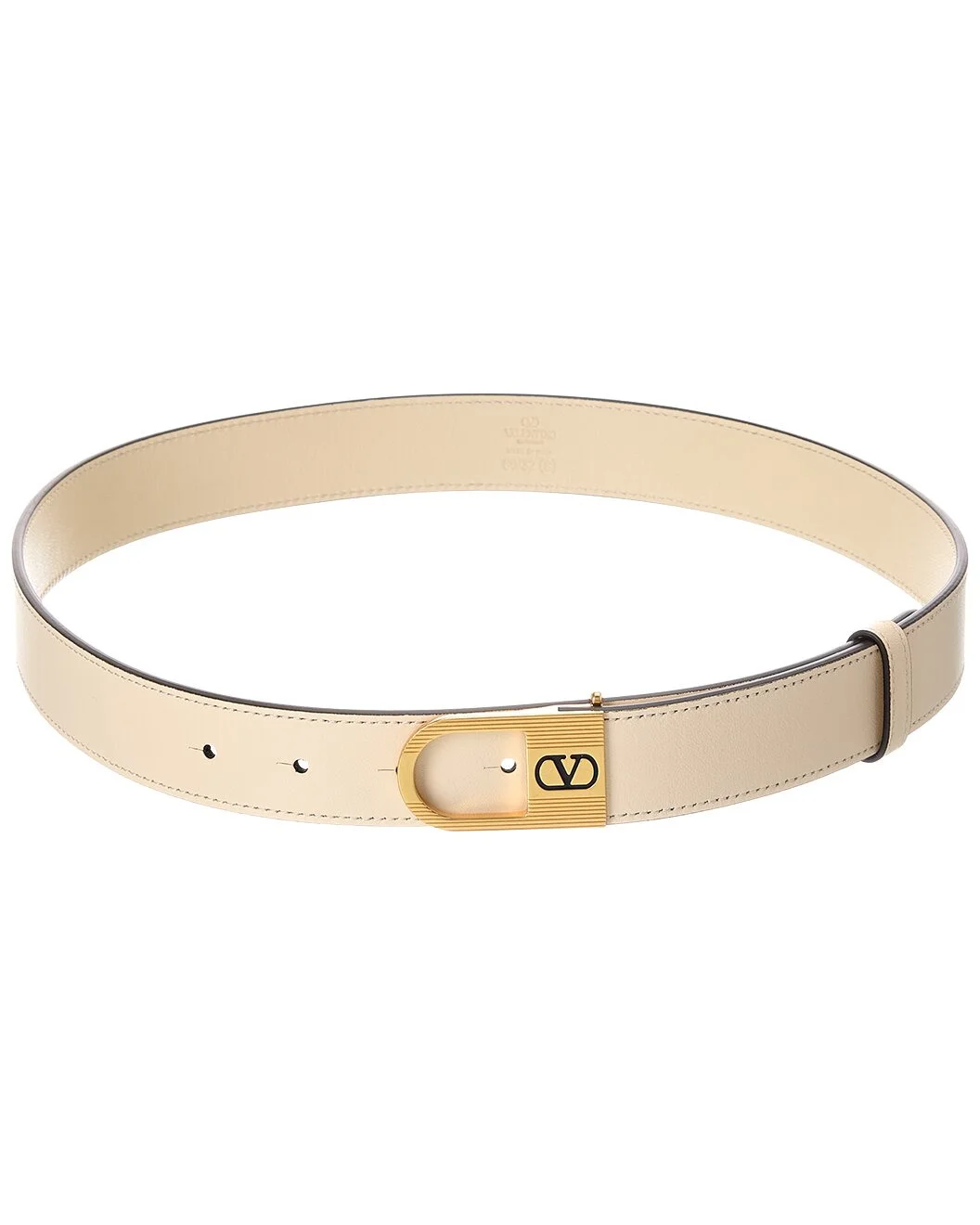 - About the brand: Signature elegance with a modern aesthetic. - Please note: Sizing is in centimeters. Please refer to the size chart for US conversions. - Color/material: white leather - Design details: gold-tone hardware and pin buckle closure - Measures 1.25in wide - Made in Italy - Please note: All measurements were taken by hand and are approximate; slight variations may occur. - Our products are 100% genuine. In some cases we purchase merchandise from trusted independent suppliers and not directly from the brand owner. In all cases we stand by the authenticity of every product sold on our site.