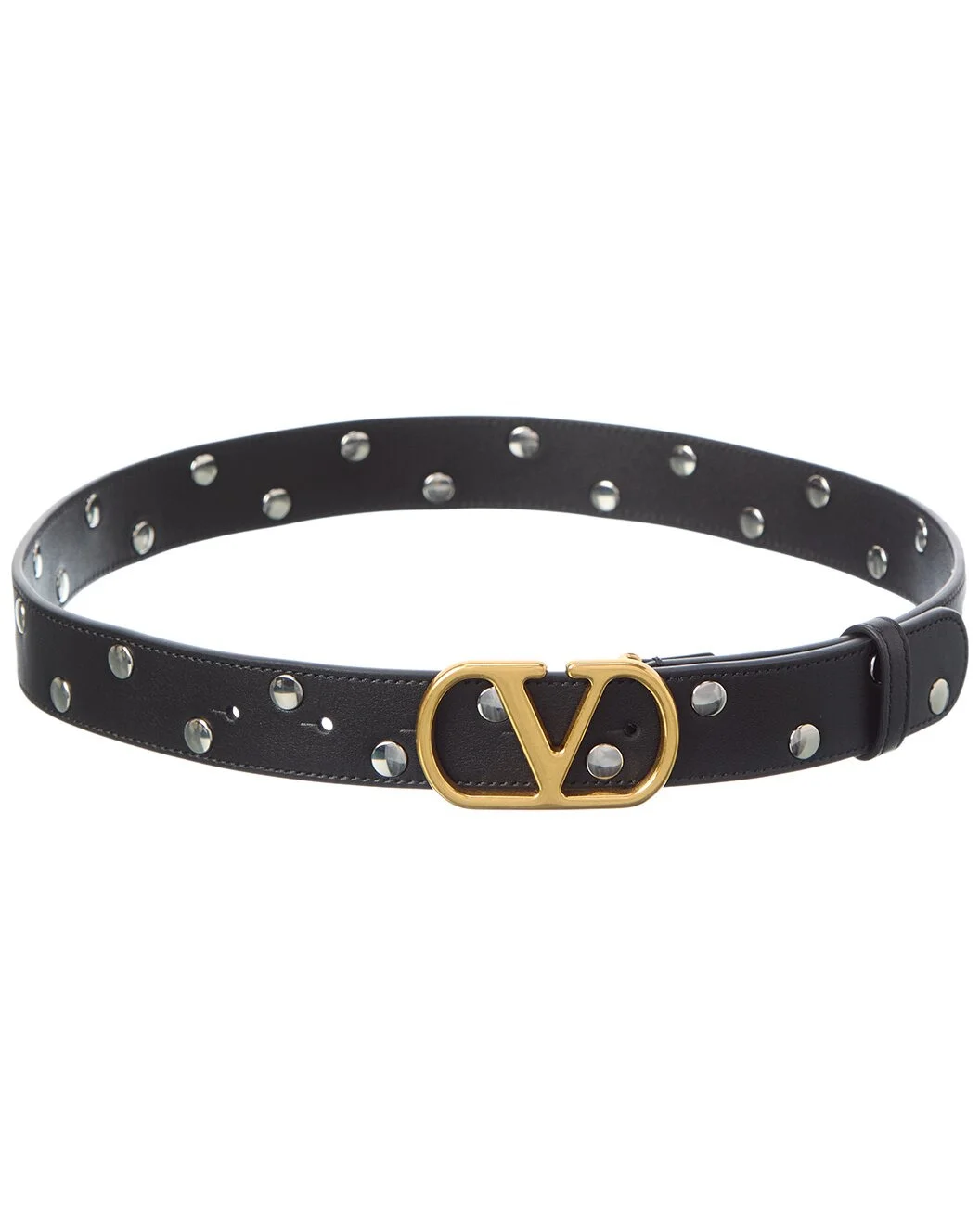 - About the brand: Signature elegance with a modern aesthetic. - Please note: Sizing is in centimeters. Please refer to the size chart for US conversions. - Color/material: black leather - Design details: gold-tone and silver-tone hardware, VLogo accent, stud embellishments and pin buckle closure - Measures 1.25in wide - Made in Italy - Please note: All measurements were taken by hand and are approximate; slight variations may occur. - Our products are 100% genuine. In some cases we purchase merchandise from trusted independent suppliers and not directly from the brand owner. In all cases we stand by the authenticity of every product sold on our site.