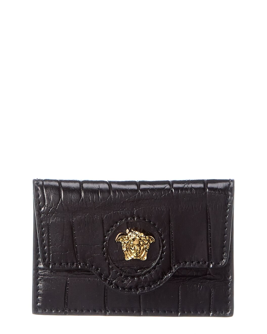 - About the brand: More is more. Bold, sexy & glamorous style from Italy. - Made in Italy - La Medusa Croc-Embossed Leather Card Holder in black croc-embossed leather and gold-tone hardware with Medusa head logo accent - Interior design details: leather and fabric lining - Measures 4in wide x 2.75in high x 0.3in deep - Please note: All measurements were taken by hand and are approximate; slight variations may occur. - Our products are 100% genuine. In some cases we purchase merchandise from trusted independent suppliers and not directly from the brand owner. In all cases we stand by the authenticity of every product sold on our site.