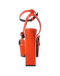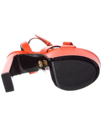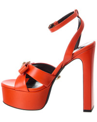 - About the brand: More is more. Bold, sexy & glamorous style from Italy. - Please note: Size selections are European. For US conversions, please reference size chart. - Made in Italy - Ribbon Leather Platform Sandal in orange leather and gold-tone hardware with bow strap with Medusa head logo accent - Adjustable ankle strap with buckle closure - Lightly padded leather insole - Smooth leather sole - 5.5in heel - 2in platform - Please note: All measurements are approximate and were taken from a size 37; slight variations may occur. - Our products are 100% genuine. In some cases we purchase merchandise from trusted independent suppliers and not directly from the brand owner. In all cases we stand by the authenticity of every product sold on our site.