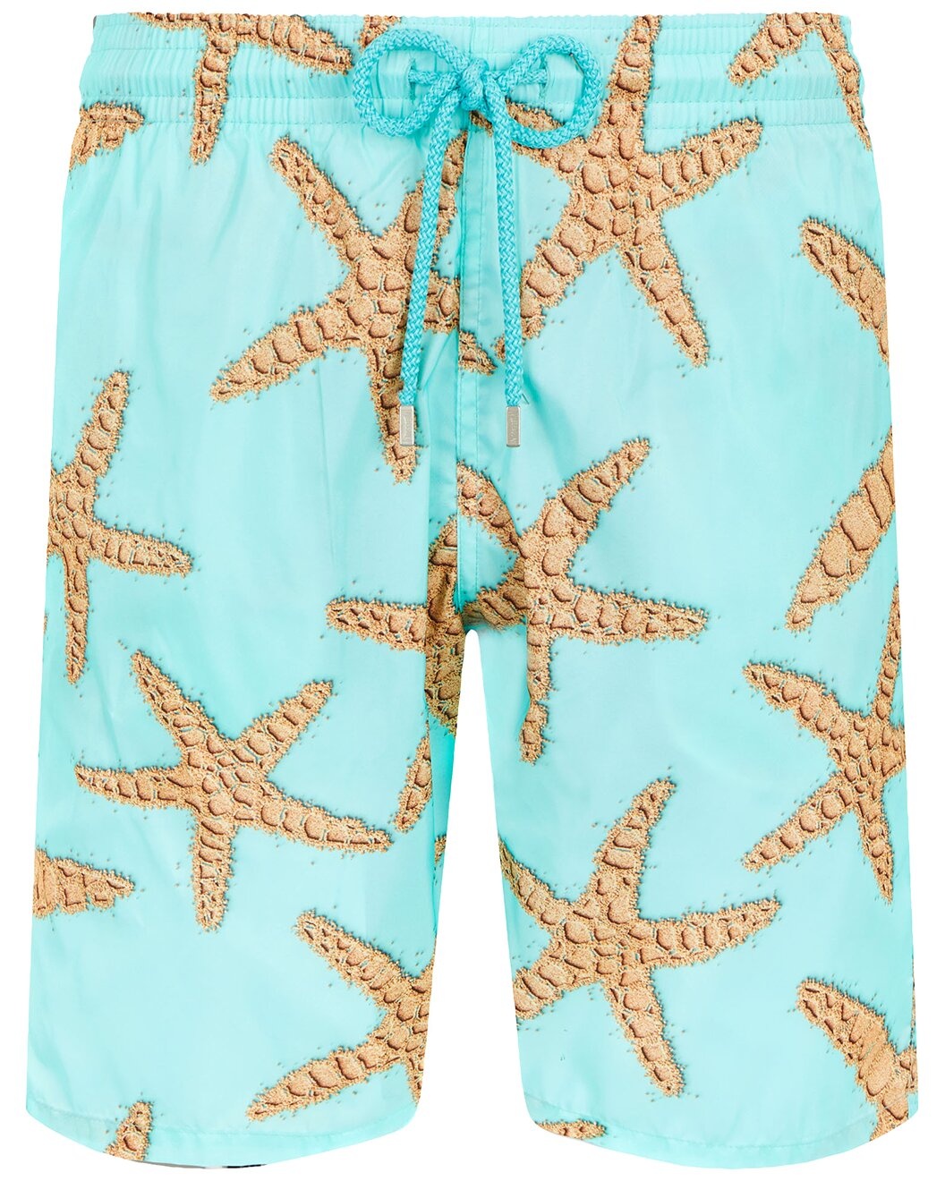- About the brand: Saint-Tropez inspired swimwear in can't-miss colors & prints. - Swim Trunk in lagoon - Falls below the knee - Inseam approximately 8.5in - The Men's Size Guide - 100% recycled polyester - Machine wash cold in gentle cycle separately do not bleach do not dry clean low iron - Imported