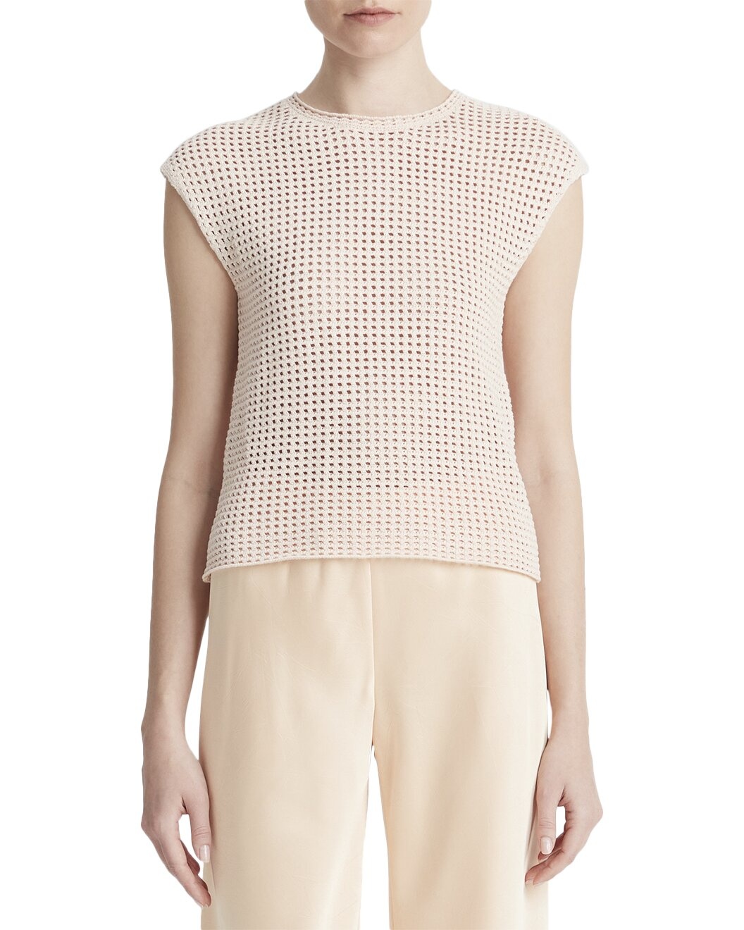 - About the Product: - Breathable Cotton Mesh Stitch Pullover with Cap Sleeves - Color/Pattern: Petal Pearl - Mesh Stitch Construction - Crewneck - Cap Sleeves - Relaxed Fit - 100% Cotton - Hand wash - Made in Italy - About the Brand: - Inspired by the natural beauty of California, Vince is a master of simplicity and laid-back staples. From understated knitwear to tailored essentials, Vince's casual cool vibes are simply timeless.