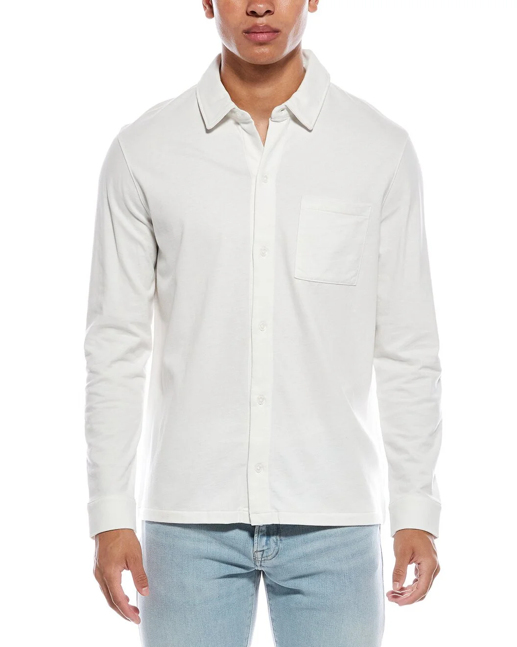 - About the brand: Inspired by the natural beauty of California, Vince is a master of simplicity and laid-back staples. From understated knitwear to tailored essentials, Vince's casual cool vibes are simply timeless. - Sueded Jersey Button-Down Shirt in off white with spread collar, chest pocket and button cuffs - Approximately 29in from shoulder to hem - Model is 6'1 and is wearing a size medium. Measurements may vary slightly by size. - Button front - 100% cotton - Machine wash - Imported - The Men's Size Guide