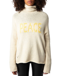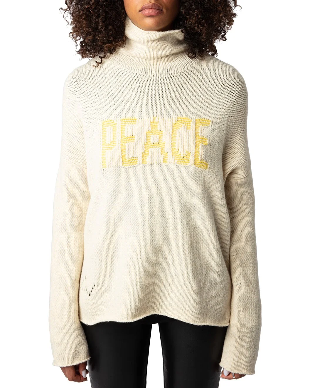 - About the brand: Zadig & Voltaire is a modern and edgy brand that plays with ambiguity in all areas of life. Based in Paris, the brand prides itself on individuality and self expression. Pulling inspiration from literary and art icons through the ages, Zadig & Voltaire embraces strength and inclusivity. - Sweater in tan - Design details: Long, loose-fitting, light yellow merino wool sweater with funnel neck and "Peace" message in contrasting tweed. - 100% wool - Machine wash - Imported