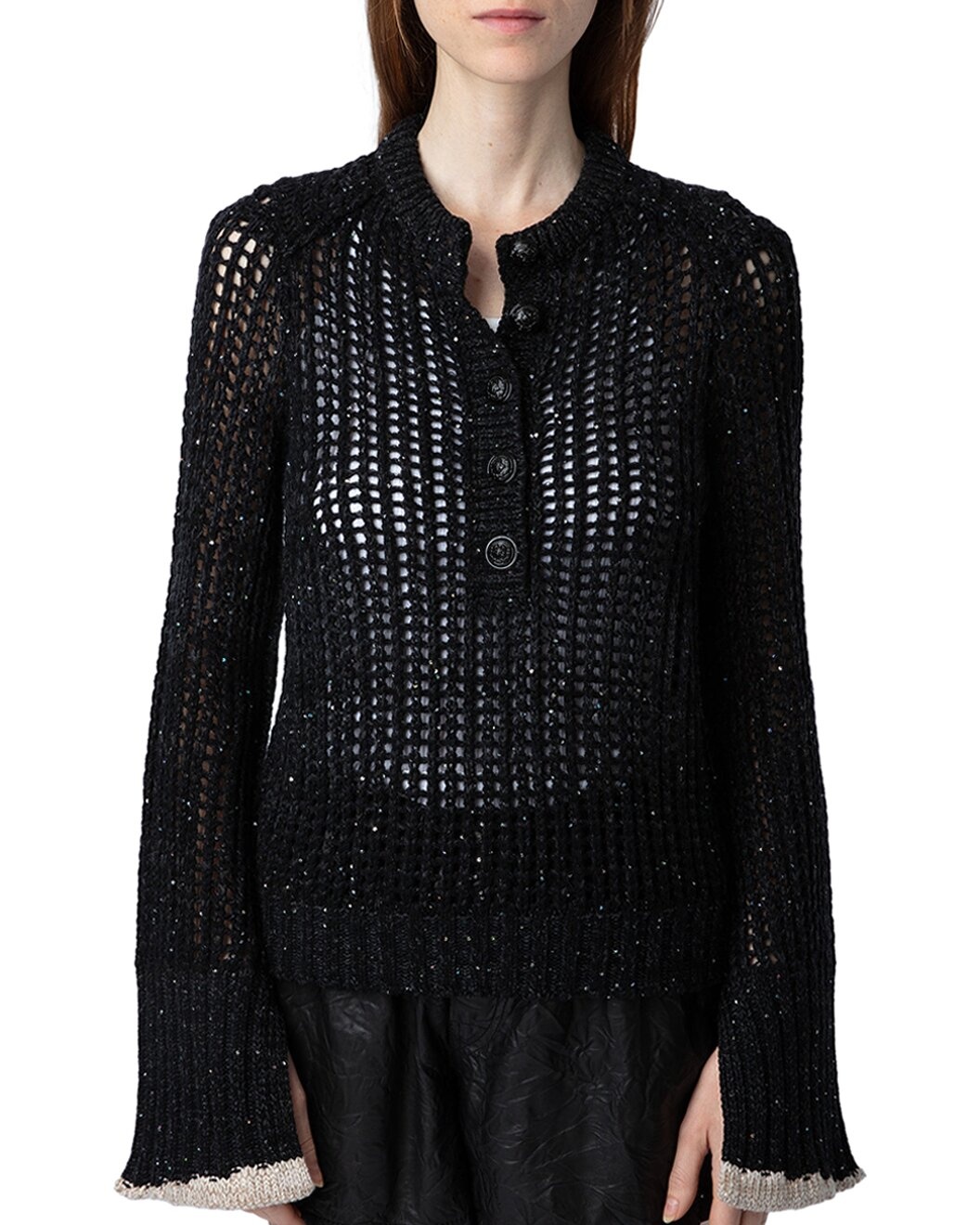- About the brand: Zadig & Voltaire is a modern and edgy brand that plays with ambiguity in all areas of life. Based in Paris, the brand prides itself on individuality and self expression. Pulling inspiration from literary and art icons through the ages, Zadig & Voltaire embraces strength and inclusivity. - Sweater in noir with henley front and rhinestone detail - Measurements taken from a size M and may vary slightly by size. - Slip-on styling - 44% cashmere, 24% wool, 22% polyester, 10% cotton - Hand wash - Imported