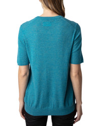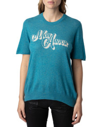 - About the brand: Zadig & Voltaire is a modern and edgy brand that plays with ambiguity in all areas of life. Based in Paris, the brand prides itself on individuality and self expression. Pulling inspiration from literary and art icons through the ages, Zadig & Voltaire embraces strength and inclusivity. - Sweater in turquoise - Design details: Short-sleeved blue feather cashmere sweater with ‘Mon Amour’ intarsia embellished with diamante on the front. - 100% cashmere - Machine wash - Imported