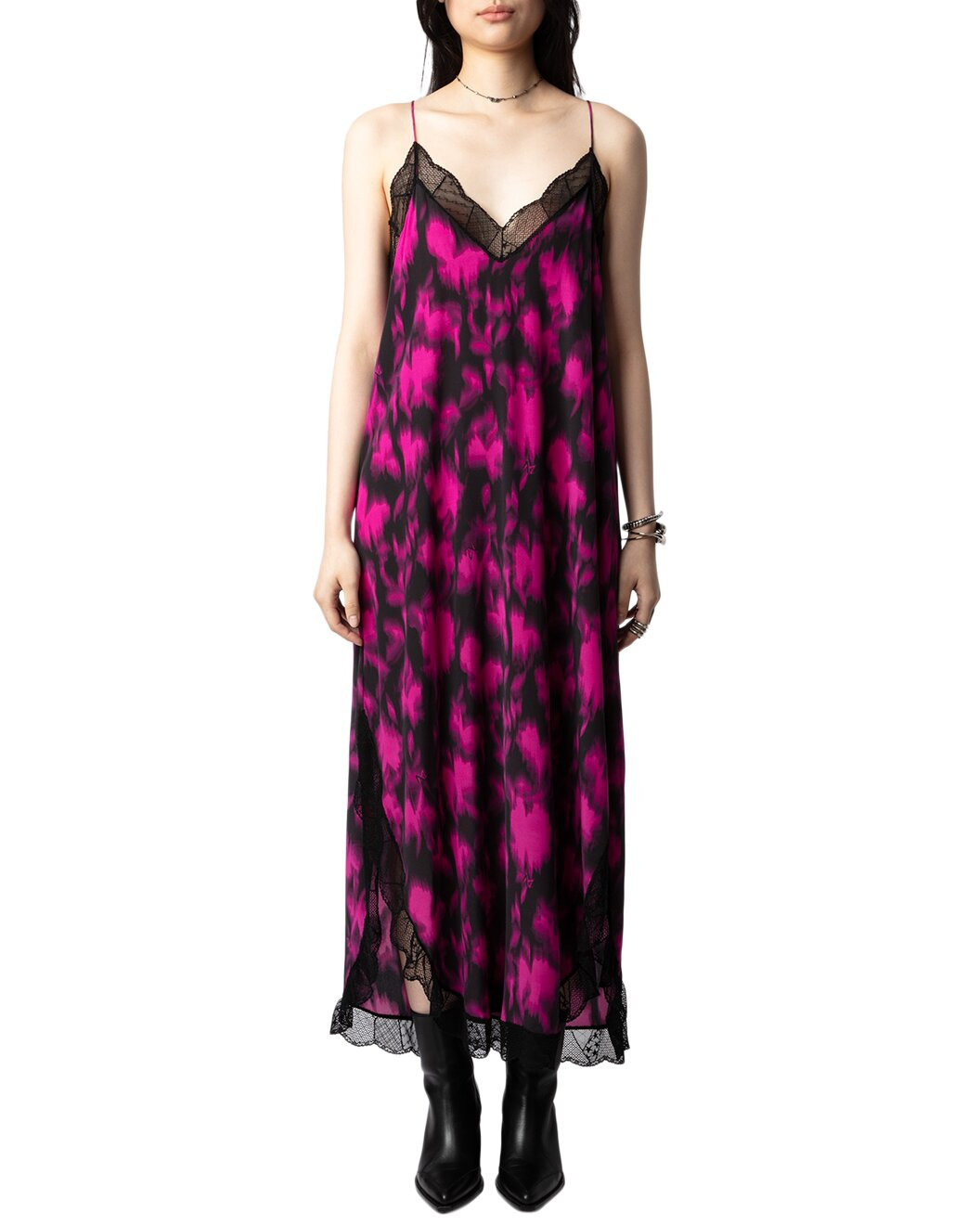 - About the brand: Zadig & Voltaire is a modern and edgy brand that plays with ambiguity in all areas of life. Based in Paris, the brand prides itself on individuality and self expression. Pulling inspiration from literary and art icons through the ages, Zadig & Voltaire embraces strength and inclusivity. - Dress in black - Design details: Pink and black floral maxi dress with floral x-ray print, straps, and lace trim. - 100% silk - Dry clean only - Imported