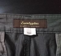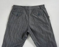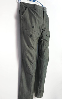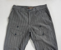 Japanese brand Eucalyptus handmade striped pants along with herringbone pattern. Comes with unique front thigh pockets with flap. Kindly note that this is a worn condition where few parts are faded, few dots and torns (pocket and bottom hem), also 1 rear pocket button not in good condition. (as in photos.) Measurement (Inches): Waist: 32” Hip: 42” Thigh: 22” Knee: 18” Front rise: 11.5" Leg opening: 16" Outseam (Length): 44” Inseam: 33” Condition: Used condition. 7/10 Material : 100% Cotton Weight: 500gm • Please check the measurements and photos • Colours may slightly vary due to photographic lighting sources / monitor settings. • Item will be shipped within 2 working days with DHL Express (5 to 7 working days to arrive) • Kindly provide your contact number for shipping purpose. Thank you.