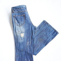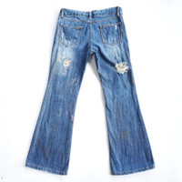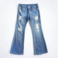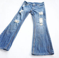 • Brand: Unknown (faded tag) • Flare cutting • Ripped at front & back • Dirty look (slightly some gold rusty effect - not so visible in photos) • Zipper closure • Low Rise • 3 front pockets & 2 back pockets • Condition: 8/10 Good used condition • Material: Cotton Measurement in Inches (done with the item laying flat): Waist: 27" Hip: 34" Thigh: 20" Front rise: 8.5" Back rise: 11.5” Knee: 15" Inseam: 27.5” Total Length: 36.5” Leg opening: 18" • Please check the measurements and photos. • Colours may slightly vary due to photographic lighting sources / monitor settings. • Item will be shipped within 2 working days with DHL Express ( 5 to 7 working days to arrive) • Kindly provide your contact number for shipping purpose. Thank you.