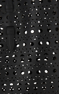 Black ‘Mina 44’ shopper bag from Alaia. Crafted from calf leather with openwork detailing, this design employs two handles and one internal compartment with a removable strapped zip pouch featuring a printed logo. Laser-cut Vienne calfskin exterior with lambskin lining Open top styling One main compartment Detachable leather zipper pouch Measures: Width 17.5"/44 cm, Height 12.5"/32 cm, D 6"/15 cm Top handles with a 8"/20 cm drop Pouch measures: W 8"/20 cm, H 4.5"/11 cm, D 0.25"/1 cm Composition: 100% Calf Leather Inner Layer: 100% Lamb Leather Made in Italy