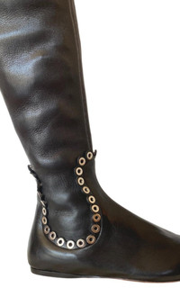Crafted in Italy, Alaïa's black leather pair is backed in a stretch fabric for the perfect streamlined fit. Metal applications. Solid color Narrow round toe line Composition: 100% Goat Leather Lining: Leather Sole: 100% Leather Made in Italy Shaft Length ~24.5"
