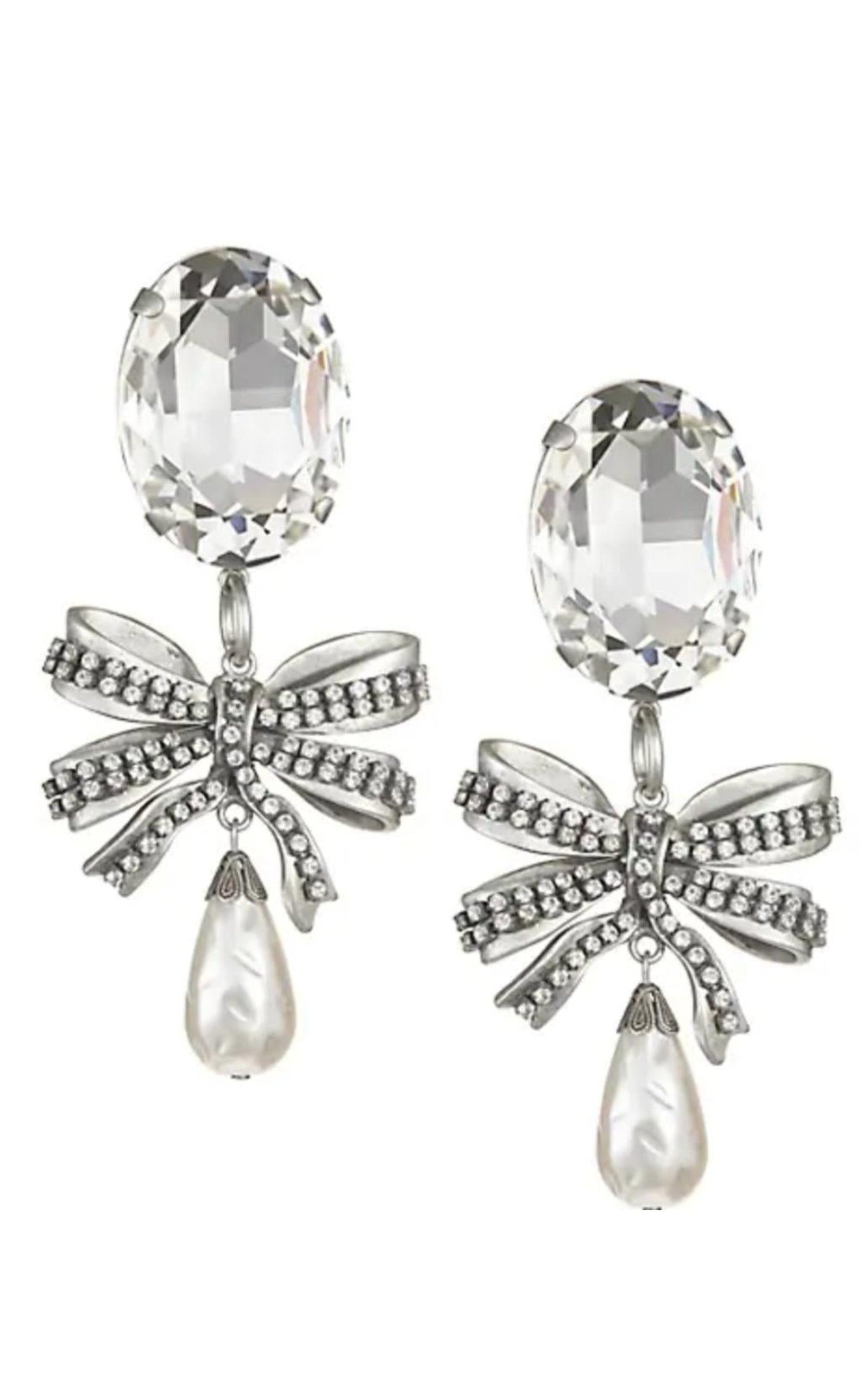 Crystal-embellished pearl drop earrings featuring bow. Clip-on fastening. Silver-tone hardware. Comes with an Alessandra Rich dustbag. Color: Crystal / Old Silver. Measurements (cm): 4.5 width x 10 height. Made in Italy.