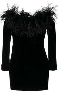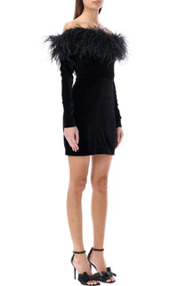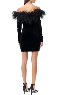 This black garment is elevated by a soft velvet construction and a feather-trimmed off-shoulder silhouette. Off The Shoulders Style Long Sleeves Concealed Rear Zip Fastening Slim Composition: 80% viscose, 10% silk, 10% viscose Lining, 65% viscose, 35% polyester Feathers; 90% ostrich, 10% turkey Made in Italy