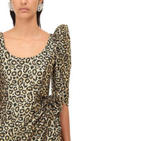 Scoop neckline Elbow length puff sleeves Concealed back hook and zip closure Back cutouts Padded shoulders Bow details Ruffled details Lined Composition: Main: 48% Polyester, 33% Metalized Polyester, 13% Silk, 6% Polyamide Lining 1: 100% Cupro Lining 2: 100% Polyamide Made in Italy
