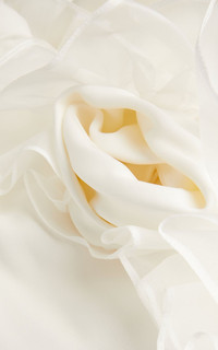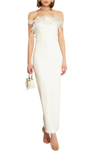 This maxi dress showcases delicate organza ruffles adorning the bust, while the strapless design creates a flattering bustier silhouette and defines the waistline. The dress also features a covered zip closure at the back and a sleek column shape with a subtle back vent for added elegance. Material: 98% viscose, 2% elastane Care instructions: dry clean Made in Italy Material II: 100% silk Lining: 95% cupro, 5% elastane Closure: concealed zipper, hook fastening