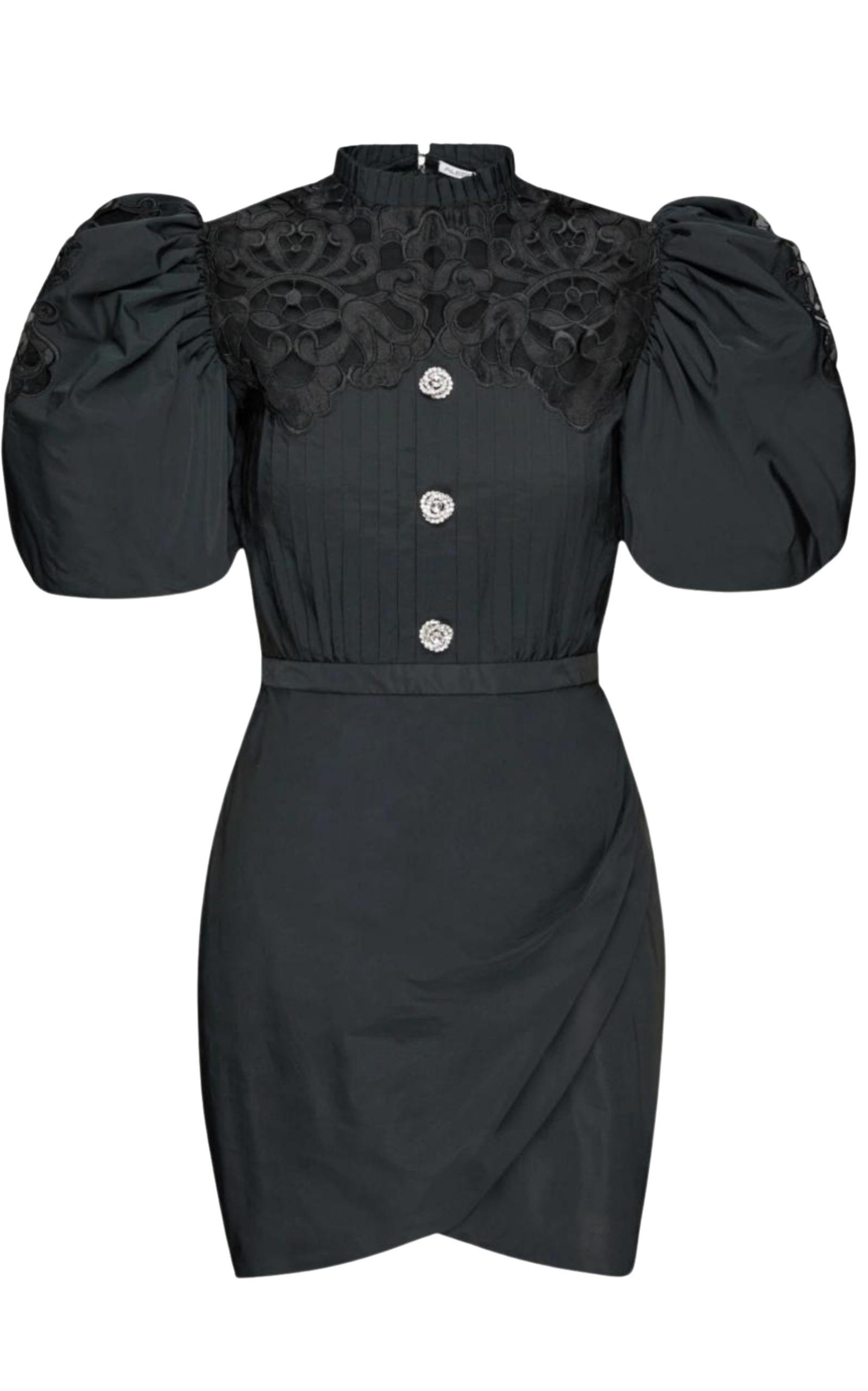 Black silk blend flared mini dress from Alessandra Rich Oversized collar Front decorative buttons Short sleeves Sequin embroidery Concealed side zip fastening Flared skirt. Composition: Silk 100%, Polyester 100% Lining: Polyamide 100%, Cupro 100% Dry Clean Made in Italy