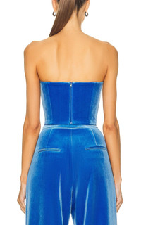 This strapless bustier top is cut from plush velvet and structured with boning. Bloom blue velvet Tonal hardware Panelled bodice Bustier-style neckline Underwire cup Rear zip fastening Straight hem Cropped Composition: Polyester 95%, Spandex/Elastane 5% Lining: Triacetate 82%, Polyester 18%