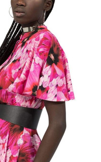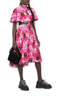 Alexander McQueen floral print silk midi dressLonguette model Korean collar with button Central foldaway closure Wide skirt with double length Rose petal sleeves Floral print Silk 100% Lining Composition: Silk 26%, Acetate 74% Made in Italy