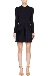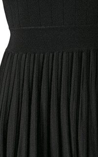 Black ribbed stretch knit a-line dress Short length. Long sleeve Stand collar. Pleated skirt. Concealed zip closure at side. Unlined. Tonal stitching. 85% viscose, 15% lycra. Made in Italy