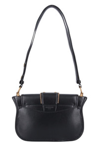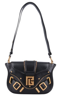 The Balmain Blaze Leather Shoulder Bag in black boasts an adjustable top leather shoulder strap for added convenience, secured with a snap flap closure. Its gold flap logo and double buckle detail on the front add a touch of sophistication. Plus, the bag features a flat back pocket and interior flat pocket within the spacious main compartment. Size and fit: H 6"/15cm X L 9"/23cm X D 2.75"/7 cm Strap span: 24.9"/63 cm Composition: 100% Calfskin Leather Hardware: Golden metal Signature dust bag included Made in Italy