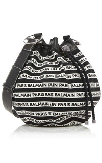 This Balmain bag is rendered in canvas and features a medallion drawstring and printed logo design. Logo-print canvas and and calfskin leather. Adjustable shoulder strap secured by rings. Open top with logo medallion drawstring closure. Color: Black/White H 18.9" x L 18.9" x W 13.4" 77% cotton; 3% elastane; 20% polyester Interior slip pocket Made in Italy