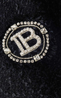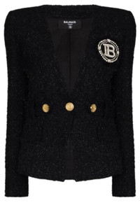 This jacket, tailored with strong padded shoulders and a nipped-in waist, is crafted of a textured tweed with a delicate metallic thread running throughout. It has a matching belt embellished with BALMAIN’s signature gold-tone embossed buttons and a dazzling crystal-encrusted logo patch at the chest. Crystal B-logo V-neck Long-sleeve Button closure Front flap pockets 51% Cotton, 49% Polyamide; Lining: 52% Viscose, 48% Cotton