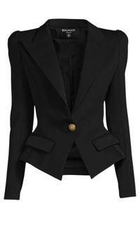 Tailored collar with wide pointed lapels Structured shoulders Button fastening, 1 signature gold "lion's head" engraved button Long sleeves Lace-up slit at the bottom of the sleeves to the elbows Side pockets with flaps Materials: 100% linen Lining: 52% viscose, 48% votton Made in Slovakia