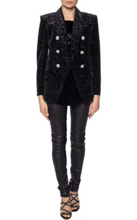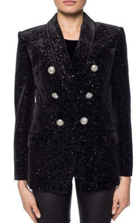 Equipped with buttoned cuffs, speared revers and structured straps, its peculiarity is the application of glitter and stars in the milky way style. Slender shawl lapels Antiqued silver-tone metal crest-embossed buttons. Features 1 slip pocket, 2 flap pockets Padded shoulders and long sleeves. Lined Composition: 92% Polyester 8% Elastane Lining: 52% Viscose, 48% Cotton Made in Italy