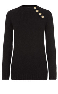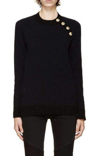 Long sleeve merino wool sweater in patterned black and navy. Ribbed collar, cuffs, and hem in black. Gold-tone buttons at shoulder with signature engravings. Tonal stitching. 100% Merino wool Designer Style ID: 6769390M Made in France.