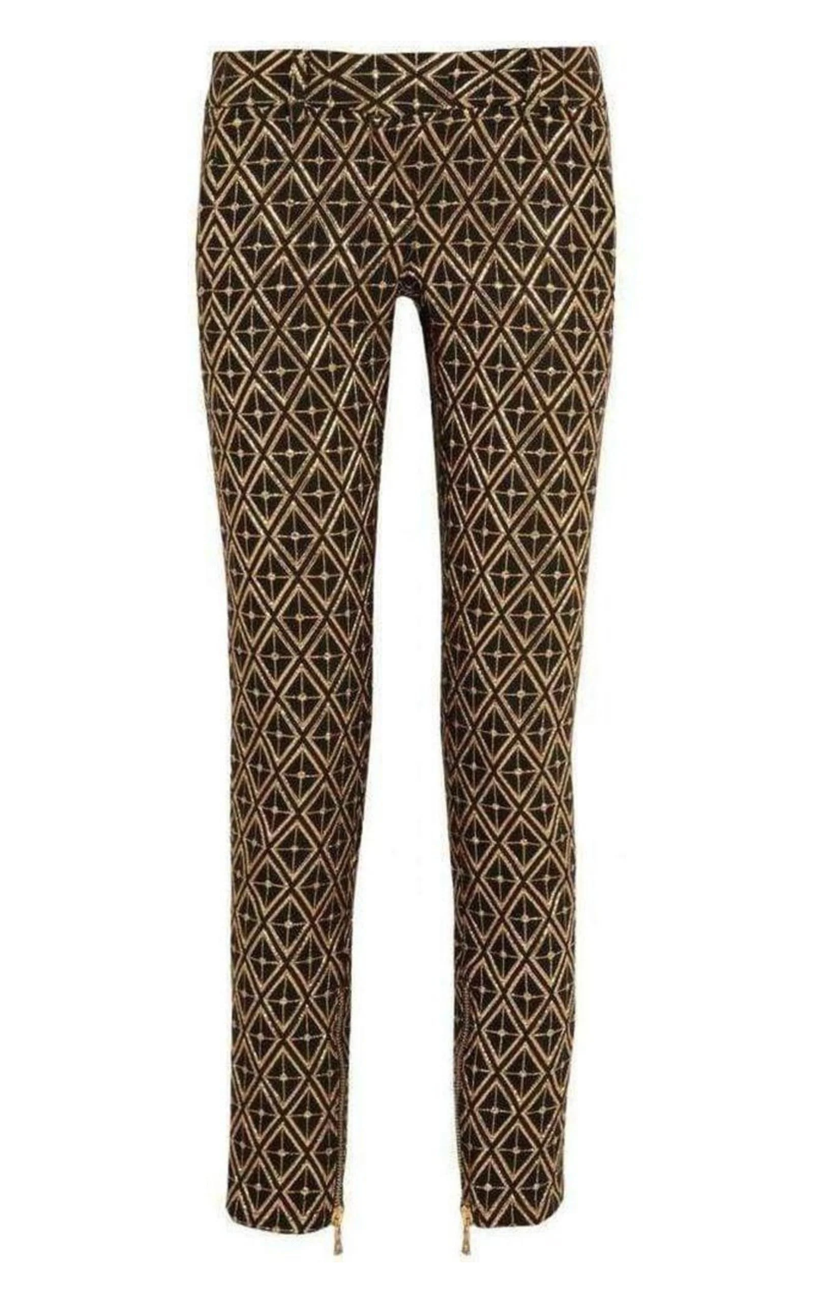 Balmain Metallic Jacquard Skinny Pants in Black and Gold – Made in France Balmain’s Metallic Jacquard Skinny Pants embody the brand’s signature fusion of opulence and precision tailoring. Crafted in France from a rich blend of silk, wool, and metallic fibers, these pants showcase a striking black and gold jacquard pattern that catches the light with every step. Designed for a sleek, sculpted silhouette, they feature zipped side slit pockets , snap-fastening back pockets , and zipped cuffs for a refined edge. The concealed hook and front zip fastening ensure a seamless fit, while the metallic weave reflects Balmain’s iconic Parisian glamour and attention to detail. Key details: • Skinny fit with sculpting silhouette • Black and gold metallic jacquard pattern • Zipped side slit pockets • Snap-fastening back pockets • Zipped cuffs with concealed hook closure • Front zip fastening • Model: 5935 114X • Color: T752 (Black & Gold) • Made in France Composition: • 45% Acrylic, 37% Wool, 7% Polyester, 7% Silk, 4% Polyamide Authenticity & care: Brand new and 100% authentic Balmain. Dry clean only. Why Shop at Runway Catalog? At Runway Catalog , we guarantee 100% authentic luxury items at unbeatable prices—often up to 80% off retail. Enjoy expertly curated collections, trusted authentication, and a personalized shopping experience. Have Questions? Visit our FAQ page for details on shipping, returns, and authenticity guarantees.