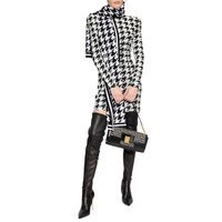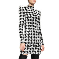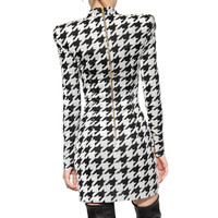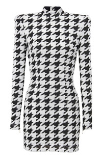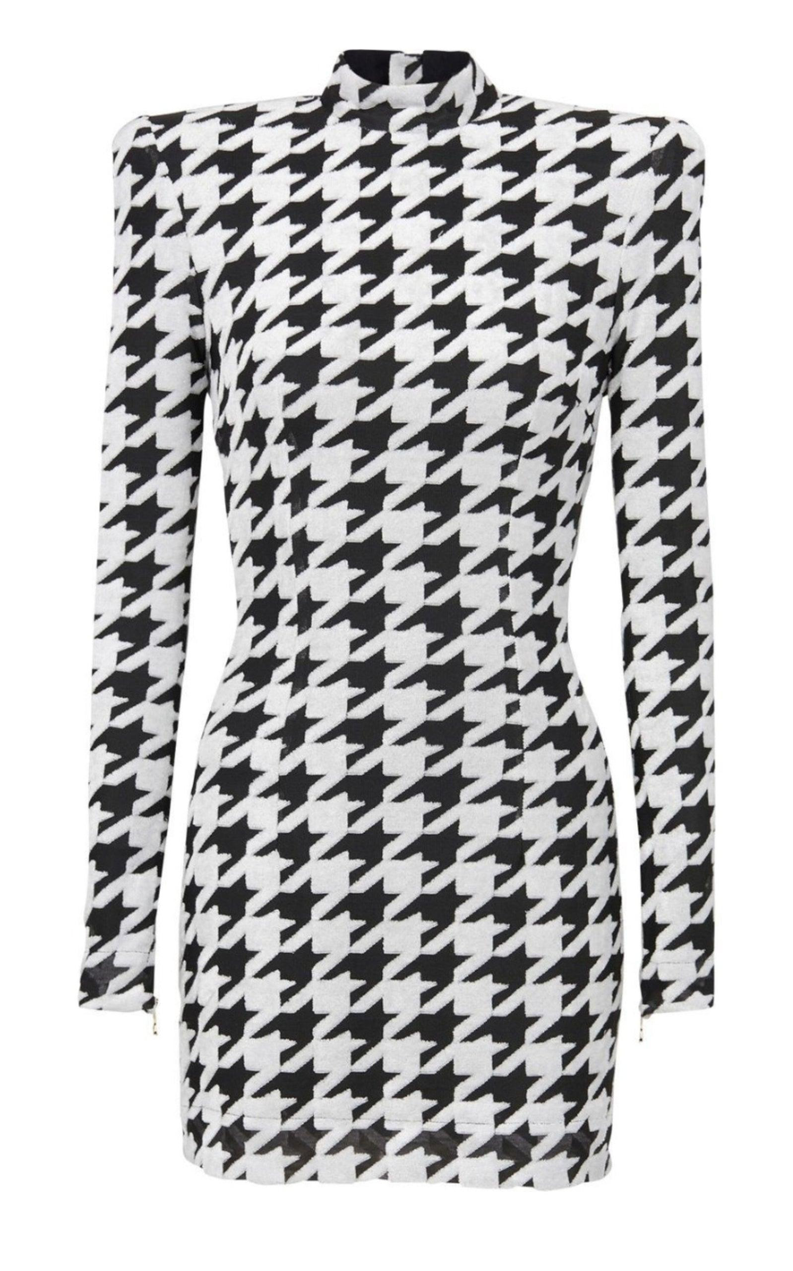 Grey and black dress from Balmain Crewneck Zip Closure on Back Long sleeves Houndstooth pattern Velvet Effect Padded Shoulders Composition: Viscose 60%, Polyester 40% Lining: 73% Acetate, 23% Silk Dry clean