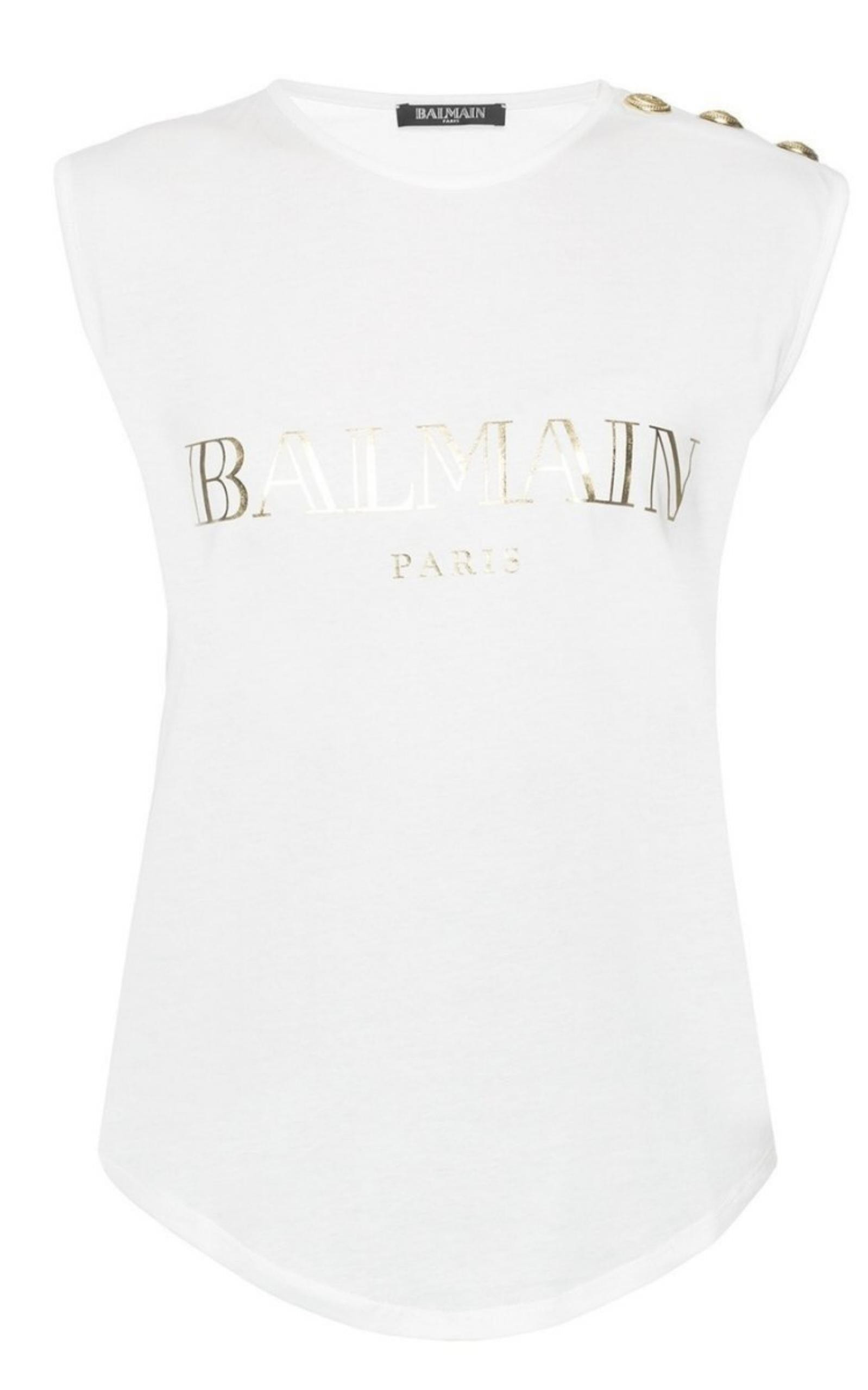 White top Decorated the front shelf with a bright gold print in the form of the logo of the brand founded by Pierre Balmand Left shoulder seam with large shiny buttons. Made of thin cotton jersey. 100% Cotton Made in France