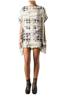 Cream printed silk dress featuring a slash neck, batwing sleeves, a loose fit and asymmetric hem. Unstructured draping silk dress in tones of black, gold, and off-white. Mixed floral and graphic prints throughout. Seam pockets at sides. Unlined. Tonal stitching. 100% silk. Made in France