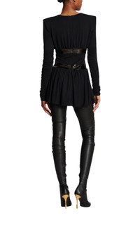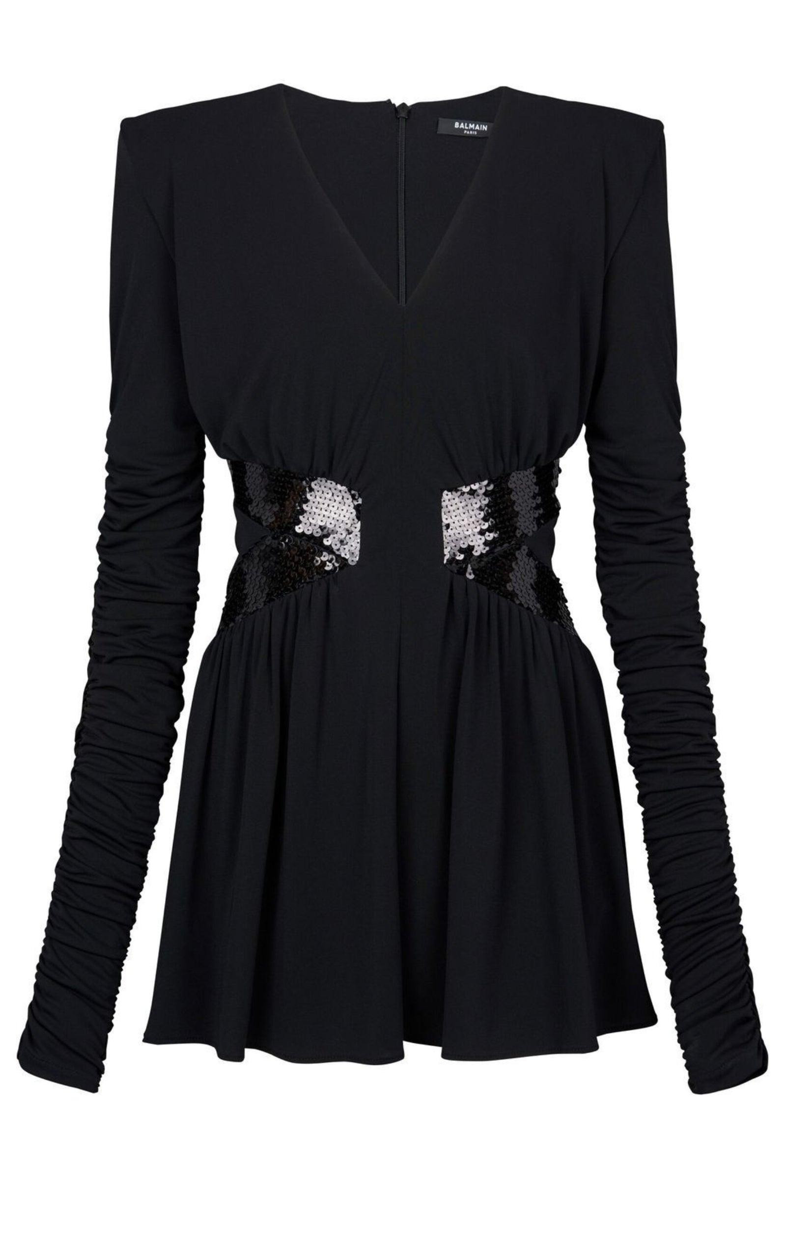 Sequin-embellished V-neck mini dress Sequin-embellished V-neck mini dress from Balmain featuring black, sequin embellishment, V-neck, crossover strap detail, long sleeves, rear zip fastening, pleated skirt and straight hem. Composition: Viscose 100% Specialist Cleaning Made in France
