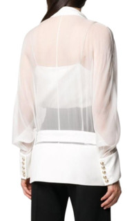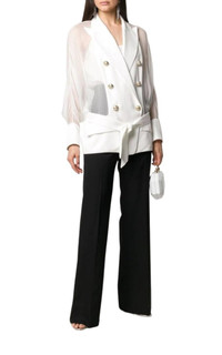 Crafted with a mixture of viscose & silk White with semi-sheer silk panels throughout Double-breasted style with a notched collar Large gold-tone logo button detailing Waist-belt fastening Long sleeves with five-button cuffs Two non-functioning front flap pockets Fabric - 100% Silk Lining - 52% Viscose, 48% Cotton Made in France
