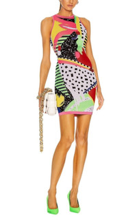 Made in Italy, this sleeveless short dress is designed with a roundneck and fitted silhouette. Crafted in an 80s-inspired jacquard print, the sleeveless dress is finished with a zip closure at the back. Fabric: Lightweight intarsia knit Ribbed edges Exposed zip at back Abstract pattern Roundneck Sleeveless Shell: 78% viscose, 13% polyester, 7% cotton, 2% polyamide Unlined Dry clean Made in Italy
