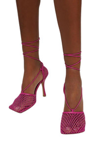 Mesh and leather upper Wraparound self-tie leather ankle laces Square toe Leather covered heel Unlined Leather insole Rubber-injected leather sole Composition: 70% Cotton, 30% Lamb Heel: 3.5" / 9 cm Designer colour name: Hollyhock Made in Italy