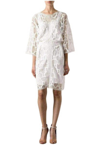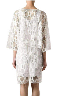Made in France with an intricate lace fabric, this 3/4 sleeve dress from Chloe conveys a feminine impression. White Lace Open Back 3/4 Sleeve Dress Fitted white Lace Round neck Drop shoulders Mid sleeves Knee length Open back Back zip fastening with hook-and-eye 100% cotton Silk-blend lining Dry clean only.