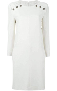 Decorative button dress Round neck Long sleeves Two side pockets Concealed rear zip fastening Straight fit Straight hem and a short length. Composition: Acetate 51%, Viscose 49% Lining Composition: Silk 100% Color: Soft beige Dry Clean Only Made in France