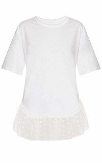 It's the cream ruffled eyelet-lace hem that white cotton-jersey T-shirt such pretty appeal. It's cut to fall loosely over the body with a round neck and dropped shoulders. White, cotton-jersey Round neck, short sleeves Cream eyelet-lace silk ruffled-hem panel Ribbed-jersey neckline Made in India