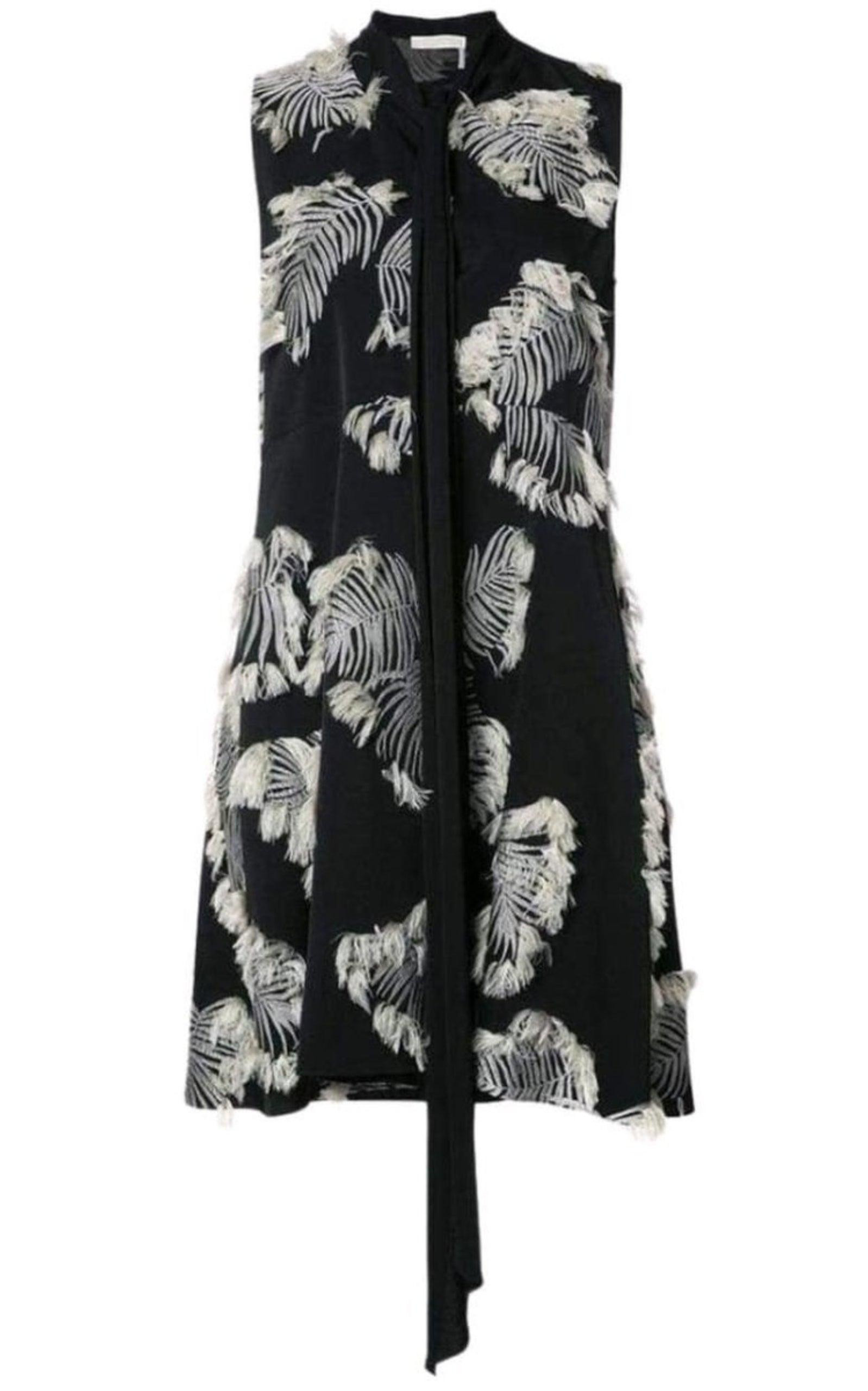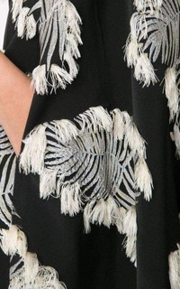 Sleeveless dress Round neck with a detachable neck tie Two side pockets All-over white jacquard palm leaf design Fringe finish material: 100% viscose embroidery: 100% polyester Designer colour name: Black/White Dry clean True to size Size 40 Bust: 38" Waist: 39" Length from shoulder: 36"