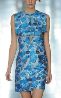 Multi blue & silver floral silk brocade dress with slit details which reveal the ghost organza layer behind Round neck with origami folded neckline. Sleeveless. Concealed zip down back. Full silk-blend lining. Body: 71% silk, 29% polyester Lining: 74% acetate, 26% silk Dry clean only. Made in UK