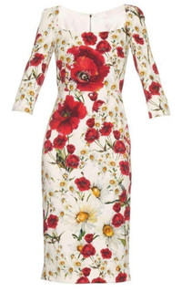 Daisy and poppy-print crepe dress White, yellow and red stretch silk blend daisy and poppy print Square neck, 3/4-length sleeves. Fitted skirt and a mid-calf length Centre-back hemline slit. Centre-back concealed-zip fastening. Ivory silk-blend-satin lining. 97% viscose, 3% elastane. Lining: 94% silk, 6% elastane. Dry clean. Fits true to size. Color: white Made in Italy Length:45" Chest: 34" Waist: 28" Hip: 36"
